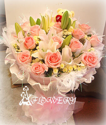 主要花材:玫瑰,百合,法雛菊或深山櫻及綠葉配材