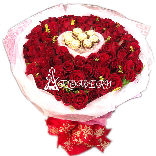 主要花材:紅玫或粉玫瑰(*擇一),麒麟草,金莎巧克力8顆