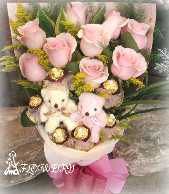 主要花材:玫瑰11朵,金莎6顆,小熊一對及其他綠色配材