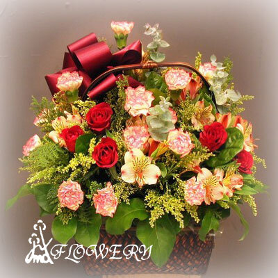 主要花材:康乃馨,玫瑰,水仙百合,麒麟草及配材