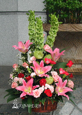 主要花材:特級康乃馨或玫瑰花20朵,貝殼花,粉百合,玫瑰,滿天星