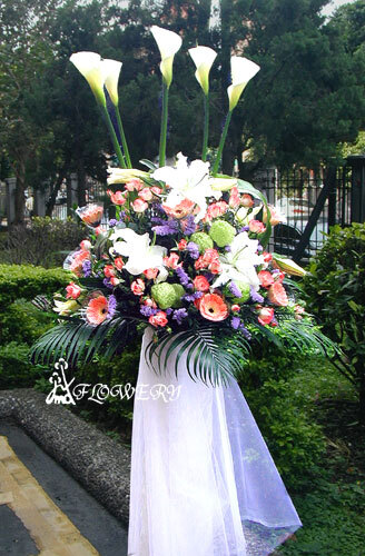 主要花材:百合、海芋、玫瑰、星辰花、太陽花及其他綠色配材