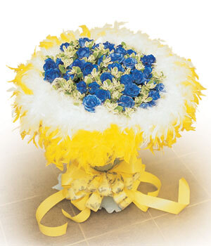主要花材:藍玫瑰,初雪草,羽毛飾條