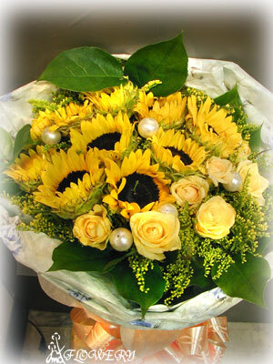 主要花材:向日葵10朵,白玫6朵,茉莉花,人造大珍珠飾品