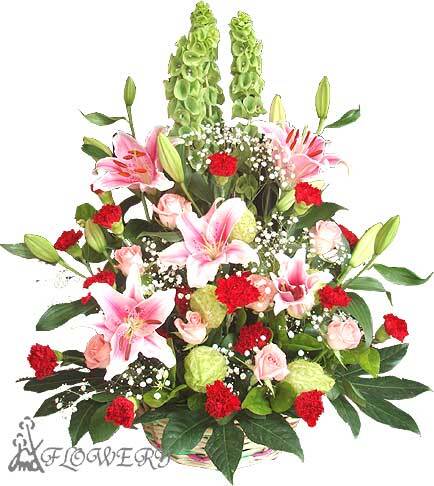 花材:粉玫瑰/康乃馨/百合/唐棉/滿天星及其他葉材