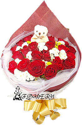 主要花材:紅玫21朵、法國小菊、茉莉花及小熊1隻