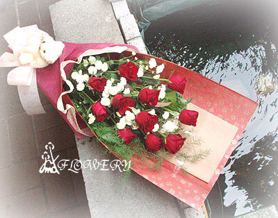 主要花材:紅玫瑰、法國小菊、小熊
