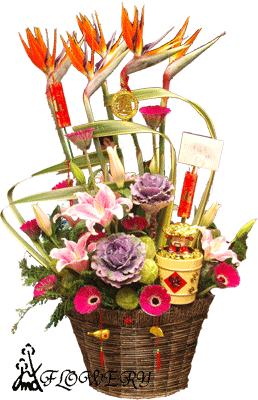 主要花材:天堂鳥.葉牡丹.百合.太陽花.賀春吊飾及其他綠色葉材