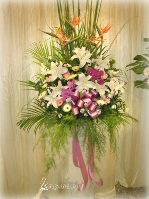 主要花材:香水百合、天堂鳥、太陽花 配 材:桔梗、蝴蝶蘭、新文竹、白竹、椰葉
