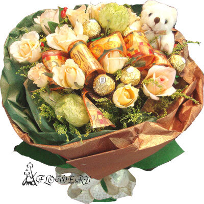 主要花材:玫瑰.金莎巧克力,小熊x1,及其他配材
