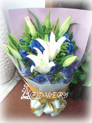 主要花材:香水百合(花苞 7朵以上)、藍玫瑰、綠色葉材